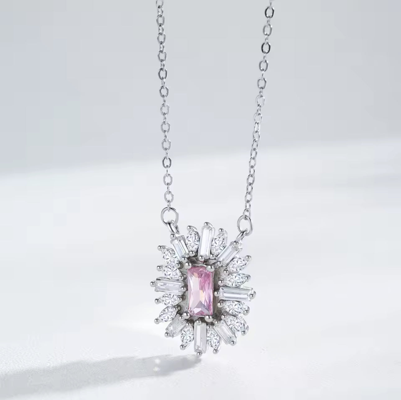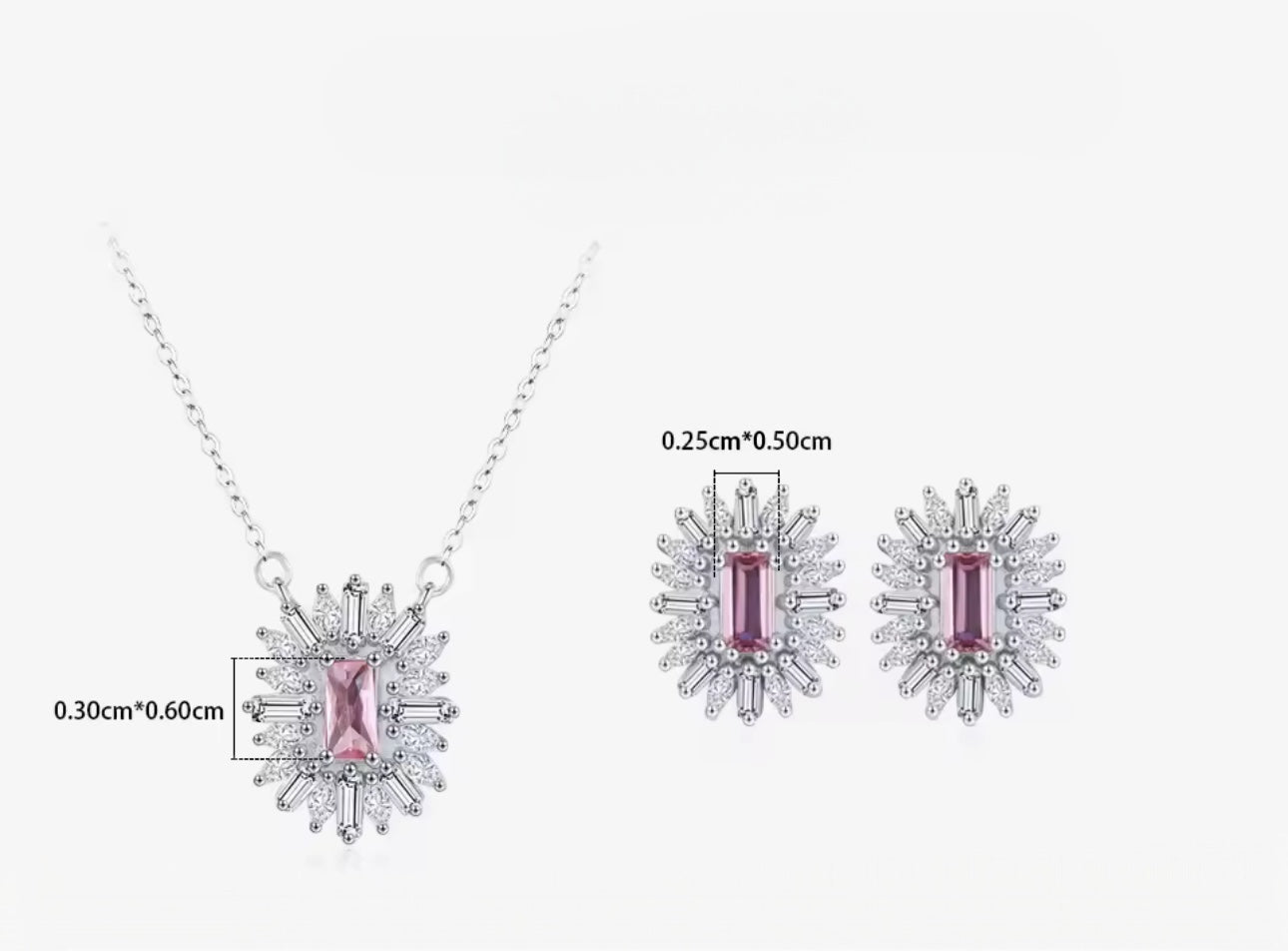 Потопете се в нежната грация на розовото с комплекта Petale Royale – съвършено съчетание от колие и обеци, изработени от 925 стерлингово сребро. Централният елемент е правоъгълен розов цирконий с форма на слънчоглед, обграден от фини бели камъни, които подчертават изяществото и блясъка му.