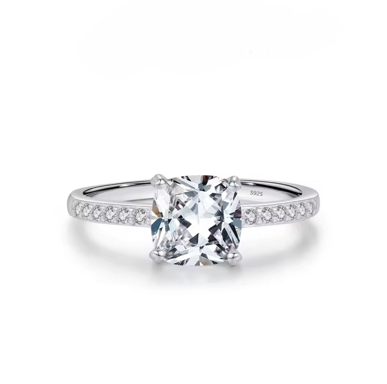 Сребърен пръстен Noema с квадратен кубичен цирконий в уникален дизайн, обграден от фини бели цирконии за неповторим блясък и изтънченост. Отличава се с модерна геометрия и луксозен акцент, създавайки пръстен, който е идеален както за специални поводи, така и за ежедневна елегантна визия.