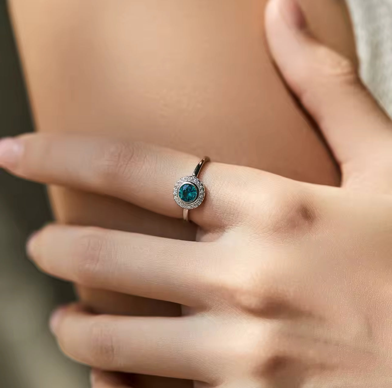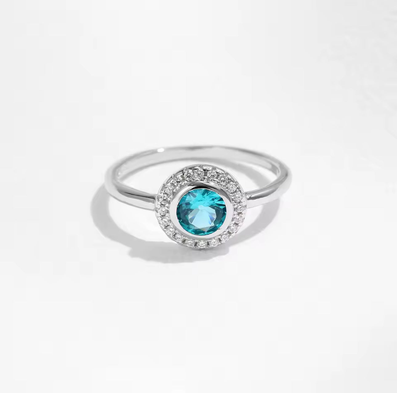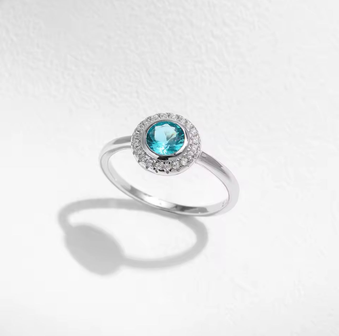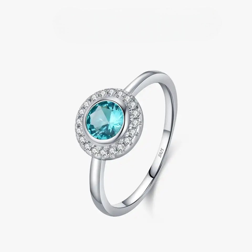 Aquarelle – дамски сребърен пръстен с аквамарин и кубични цирконии. Aquarelle е изискан сребърен пръстен за жени, който съчетава класика и модерен стил. Централният камък в нежно синьо-зелен нюанс е истински аквамарин, символ на свежест и дълбочина, а фин ореол от блестящи кубични цирконии улавя светлината с всяко движение. Перфектен дамски аксесоар за ежедневна или вечерна визия и отличен избор за подарък.