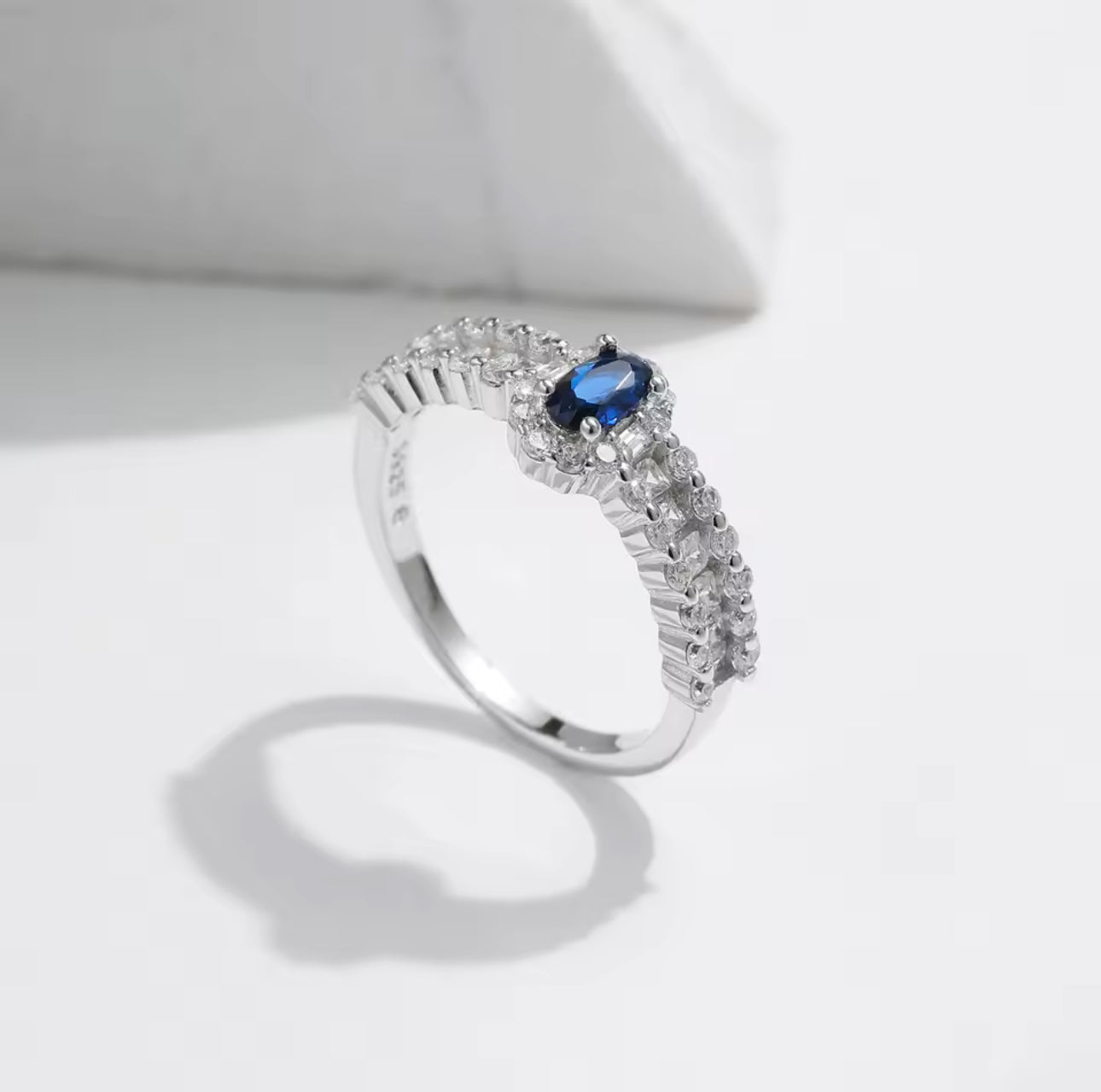Celeste е изящен дамски сребърен пръстен от стерлингово сребро S925, в центъра на който блести овален син кубичен цирконий (CZ) – символ на чистота, интуиция и вътрешен мир. От двете страни пръстенът е инкрустиран с бели кубични цирконии, които подчертават сиянието на основния камък и добавят допълнителен блясък.