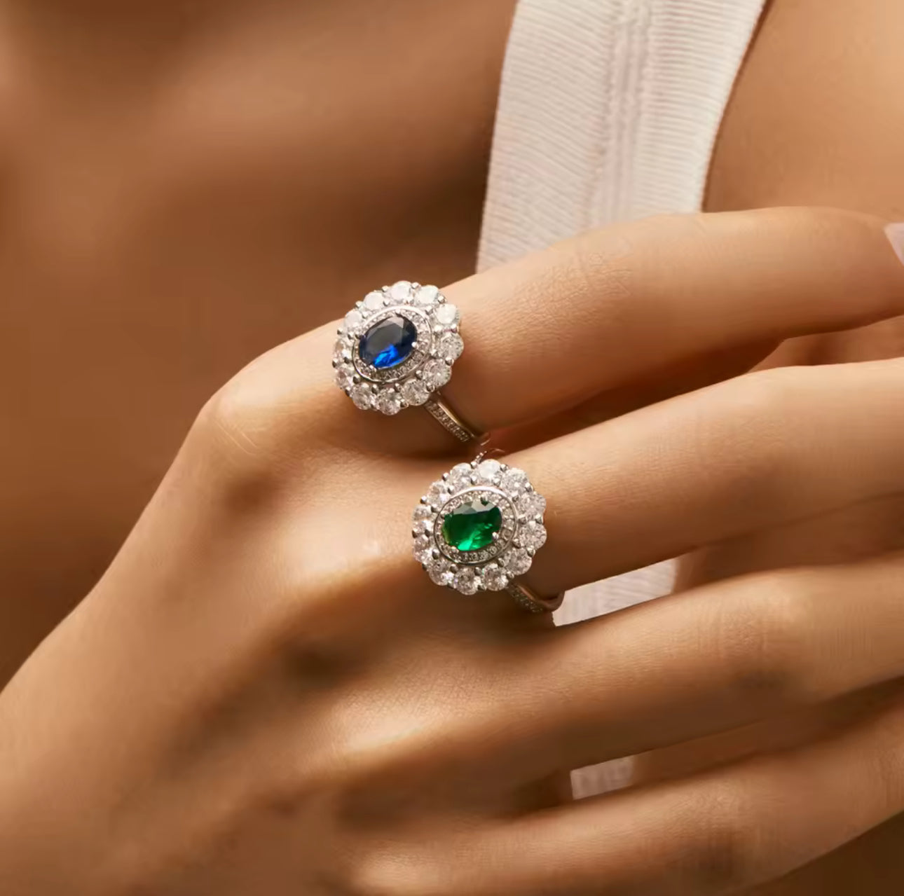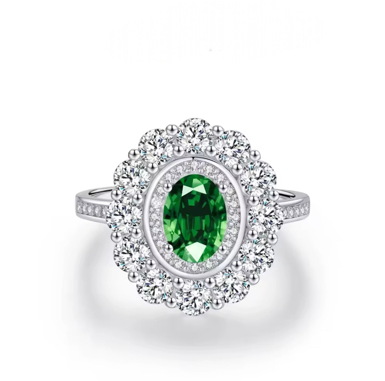Diana Emerald е изключителен дамски сребърен пръстен 925, изработен вдъхновен от неподражаемия стил и елегантност на принцеса Даяна от британското кралско семейство. В центъра блести овален зелен кубичен цирконий, символ на изтънченост, грация и благородство. Фино инкрустирани бели кубични цирконии подчертават сиянието на камъка и придават допълнителен луксозен блясък.